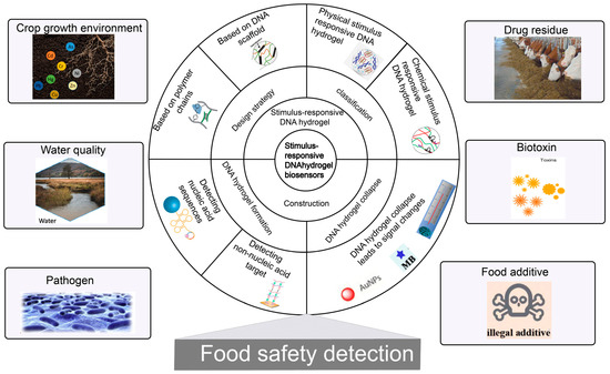 A biosensor is an analytic device that combines a biological component with a physicochemical detector to detect analytes [32]. Compared to existing food safety detection methods, biosensors offer significant advantages such as low cost, rapid analysis, and ease of use [33,34]. Due to the advantages of biocompatibility, programmability and good external response, stimulus-responsive DNA hydrogel can be used as a recognition element for biosensors to improve the sensitivity and specificity [35]. In this review, we will first outline general strategies for constructing stimulus-responsive DNA hydrogels. Then, according to different external stimuli, two types of DNA hydrogels are introduced: physical and chemical stimuli-responsive DNA hydrogels are introduced. Finally, the latest research progress on stimulus-responsive DNA hydrogel-based biosensors for food safety detection, challenges and an outlook of the future developments of this rapidly evolving field are presented, respectively (Figure 1).