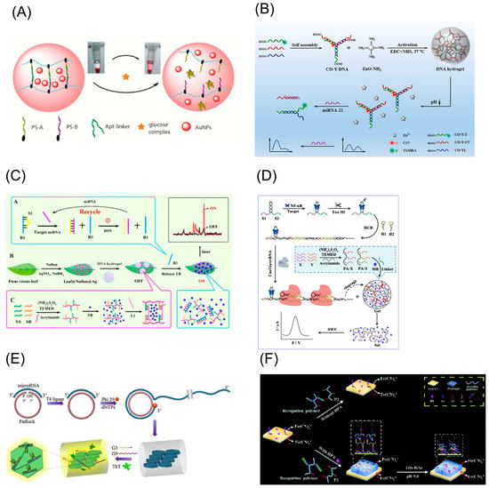 Nucleic acid amplification techniques introduced above for preparing DNA hydrogel are typically used for the construction of such sensing strategies because these amplification techniques often require a nucleic acid primer strand to initiate an amplification reaction, such as RCA and HCR. Accordingly, if the target substance is a nucleic acid sequence (DNA or RNA) [94], the target itself can be designed as a primer for a nucleic acid amplification technique (Figure 4E). Through the capture and analysis of signal molecules encapsulated in the DNA hydrogel generated by the primer regulation, the quantitative detection of the target sequence can be achieved. If the target substance is a non-nucleic acid, the detection task of the target substance is often converted to the detection of the aptamer by adding a biological recognition process of the target substance and the aptamer [95] (Figure 4F).