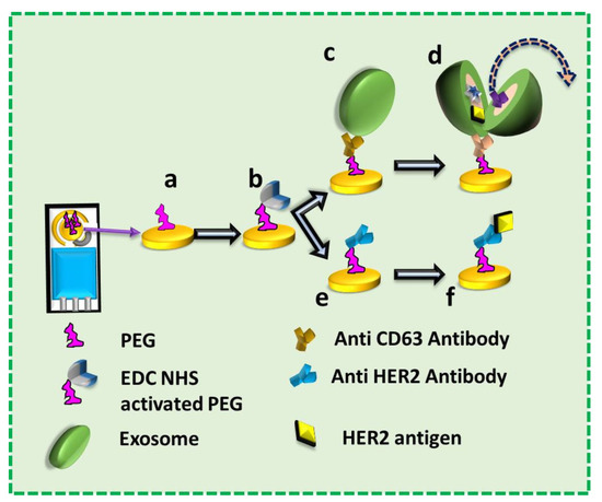 Figure 1. The flow of the work. a: Polyethylene Glycol (PEG) functionalized on the Screen-Printed Electrode (SPE); b: Activation of COOH group of PEG with EDC NHS; c: SPE functionalized with anti-CD63 Antibody and immobilized with exosome; d: Lysing of exosomes on SPE by electric field; e: SPE functionalized with anti-HER2 Antibody; f: Immobilization of exosomal protein (HER2) on the SPE functionalized with anti-HER2 Antibody.