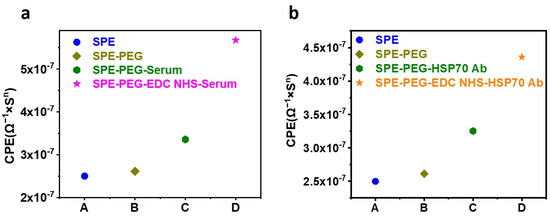 In addition to TMB HRP-based detection, the SPE functionalized with 285 µM PEG was utilized for EIS sensing to confirm the activation of COOH of the PEG with EDC NHS. The COOH of the PEG was activated with a 28 mM concentration of EDC, which was then incubated with serum. Figure 2 depicts the equivalent CPE obtained from the corresponding Nyquist plots following EIS sensing. In Figure 2a, the EIS results reveal that the conjugation of the serum protein to the EDC-activated PEG on the SPE significantly increases the CPE. As a standard, the CPE obtained from the SPE without EDC activation was utilized. Figure 2b demonstrates the binding of HSP70 Antibody to EDC-activated PEG. The results indicate two conclusions: first, PEG increases the sensitivity of the SPE; second, EDC NHS activation of PEG is required for protein conjugation.