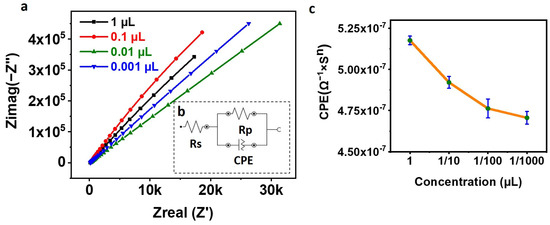 A saturation test was performed to maximize the amount of CD63 Antibody on the SPE, which, in turn, increases the number of exosomes that can be captured on the SPE surface. After activating the COOH of the PEG with EDC NHS, the SPEs were incubated with different concentrations (1 µL, 1/10 µL, 1/100 µL, and 1/1000 µL) of anti-CD63 Antibody for 30 min, followed by washing for 10 min and tested for EIS. Figure 3a shows the Nyquist plots, Figure 3b shows the circuit used for fitting the Nyquist plots, and Figure 3c shows the plot of CPE vs. concentration. From Figure 3a, it can be observed that increasing the Antibody concentration reduces the net impedance as observed by other researchers also [25]. Figure 3c shows a linear relation between the CPE and the amount of anti-CD63 Antibody used for functionalizing the SPE. Increasing the concentration of the Antibody to the PEG increases the net capacitance, thereby reducing the net impedance. We chosen to functionalize the SPE with 1 µL of CD63 Antibody to maximize the exosome capture.