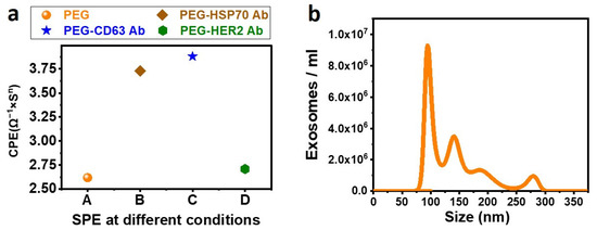 Figure 4. (a) CPE is obtained from an equivalent Randles Circuit at different conditions of the Screen-Printed Electrode (SPE). SPE functionalized with PEG, COOH of the PEG activated with EDC-NHS, and SPE conjugated with different Antibodies (anti-HSP70, anti-CD63, and anti-HER2) are fitted using a Randles circuit, and the corresponding CPE is plotted. (b) NTA characterization of exosomes. The results show isolation of 3.5 × 108 exosomes/mL serum. The maximum number of particles is found to be at 100 nm.