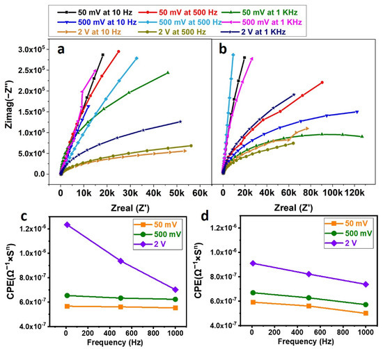 After incubating the exosome on the SPE, detailed experiments were performed to lyse the exosomes with different voltages (50 mV, 500 mV, and 2 V) and frequencies (10 Hz, 500 Hz, and 1 KHz). The exosome lysate solution was incubated with the SPE functionalized with anti-HSP70 protein for 30 min at 4 °C, and finally, after washing, the buffer was replaced with SPB, and EIS readings were taken. Figure 5a,b correspond to the Nyquist plots, for sine and square waves, which were fit using the Randles circuit, and the corresponding CPEs were plotted against the frequency in Figure 5c,d. The values are summarized in Table 1.