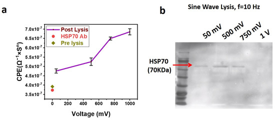 To study the role of exosome lysis in detail, further experiments were performed with a sine wave at a frequency of 10 Hz with different voltages (50 mV, 500 mV, 750 mV, and 1 V). After applying a lysing voltage to the exosomes, immobilized on the SPE, the lysate solution was used for EIS and Western blotting. For EIS, the lysate solution was directly incubated with the SPE functionalized with anti-HSP70 Antibody for 30 min at 4 °C, followed by washing and sensing. The corresponding EIS results are shown in Figure 6a. The increasing CPE value with an increase in the lysis voltage indicates better lysis of exosomes at higher voltages.