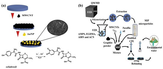 (a) The determination of cefadroxil β-lactam antibiotic was carried out using a modified gold nanoparticle/multiwalled glassy carbon nanotube [34]. (b) Molecularly imprinted carbon paste electrode for furazolidone detection [35].