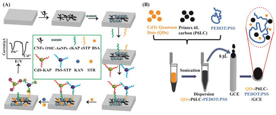 Nanomaterial-based electrochemical methods for antibiotic analysis. (A) The ultrasensitive electrochemical detection of kanamycin and streptomycin carbon nanofibers and mesoporous carbon-gold nanoparticles [40]. (B) An electrochemical device for the determination of amoxicillin based on a combination of nanomaterials such as Printex 6 L Carbon and cadmium telluride quantum dots within a poly(3,4-ethylenedioxythiophene) polystyrene sulfonate film [41].