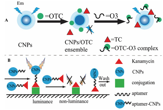 Carbon nanoparticle-based fluorescence methods for the determination of antibiotics. (A) Competitive analysis for oxytetracycline, based on aptamer and carbon nanoparticles [48]. (B) Microplate-based fluorescence method for kanamycin detection based carbon nanoparticles [49].