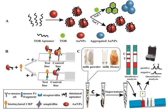 Nanomaterial-based colorimetric methods for antibiotic analysis. (A) The determination of tobramycin based on unmodified AuNPs, a single-strand DNA (ssDNA) probe, and AuNPs [53]. (B) Visual detection of ampicillin based on the combined of aptamer-based LFA and AuNPs [54]. (C) A fast and on-site detection of kanamycin, based on LFA with kanamycin-aptamer-modified AuNPs [55].