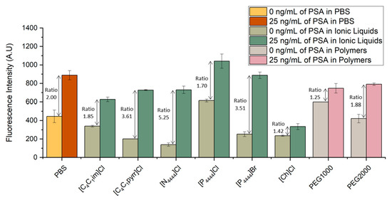 The bead-based sandwich immunofluorescent assay was performed for the quantification of PSA spiked in six ILs and two different molecular weight PEGs aqueous solutions. The signals obtained were compared with the fluorescence intensity previously obtained with the spiked samples prepared in PBS. The results are shown in Figure 2. For each system, PSA samples with concentrations of 25 and 0 ng/mL were spiked in final concentrations of PBS 1×, 5 wt% IL solutions or 5 wt% PEG solutions.