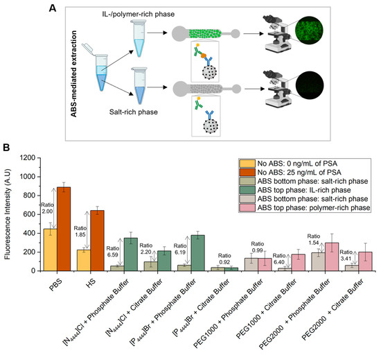 ABS were shown to be formed in the presence of human serum in the following mixture compositions, which were further used to carry out the extraction of PSA: 30 wt% IL or PEG + 12 wt% salt + 10 wt% human serum + 48 wt% water, for systems prepared with phosphate buffer as salt component and 25 wt% IL or PEG + 20 wt% citrate buffer + 10 wt% human serum + 45 wt% water for systems prepared with citrate buffer as salt component. These two mixture compositions were chosen based on the phase diagrams of the respective IL–salt–water or polymer–salt–water ternary systems [40,41,42,43], ensuring a common biphasic point for each set of systems. For each system composition, two ABS were prepared: one with human serum spiked with 25 ng/mL of PSA and another with human serum with 0 ng/mL of PSA, corresponding to the control sample. After a careful separation of phases, the amount of PSA present in the top and bottom phase was quantified using a microfluidic bead-based sandwich assay, as previously described (Figure 4A). The results obtained were compared with the fluorescence signals derived from the assays performed with PSA spiked in PBS, in which no ABS-mediated extraction was used (Figure 4B). For each phase, the fluorescence signal obtained for the control sample, i.e., human serum sample with 0 ng/mL of PSA, was subtracted from the fluorescence signal obtained for the human serum spiked with 25 ng/mL of PSA. This calculation was done to eliminate the effect of non-specific interactions inherent to the sandwich immunoassay herein developed.