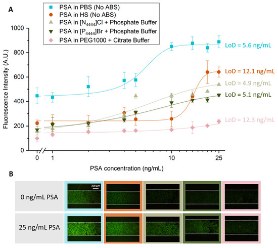 Reports on the use of microfluidic immunoassays to detect PSA are currently available. For instance, in 2015, Madaboosi et al. [9] presented an antibody-based sandwich immunoassay in a bare microfluidic channel using an amplification strategy based on biotin–streptavidin chemistry to reach clinically relevant limits of detection for PSA samples spiked in phosphate-buffered saline (PBS). Moreover, in the same year, Jolly et al. [7] demonstrated the use of a sandwich immunoassay for the detection of PSA in PBS, in which the capture antibody is replaced by a DNA aptamer. Nevertheless, these studies do not present a solution for the possible interference of biological matrices in the detection of PSA. A promising strategy to deal with some of the challenges of analyzing PSA in human fluids was proposed by Pereira et al. [26], reporting an IL-based ABS technique with the goal to extract and concentrate PSA from urine prior quantification by chromatography. Despite the advantages of microfluidic devices to expedite detection and of IL-based ABS to improve target analyte extraction, their combined use for PSA detection in human serum has lagged behind.
