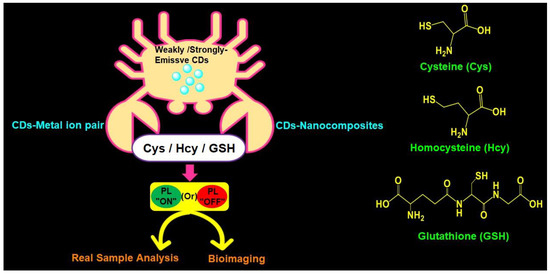 Recently, Khan et al. (2020) delivered a comprehensive review covering reports on both CDs and graphene dots (GQDs)-based biothiols sensing [55]. However, to date, the availability of a review focused on fluorescent CDs-based biothiols detection with information on recent trends, mechanistic aspects, linear ranges, LODs, and real applications is lacking, which allows us to deliver this comprehensive review. In this review, the use of emissive CDs in the assay of biothiols (Cys, Hcy, and GSH) is discussed with information on synthesis, photoluminescence quantum yield (PLQY), and demonstrative applications. Moreover, probe/CDs selections, sensory requirements, merits, limitations, and future opportunities for a fluorescent CDs-based biothiols assay are suggested for readers. Figure 1 illustrates schematics of applications and structures of fluorescent CDs-based assay of Cys, Hcy, and GSH.