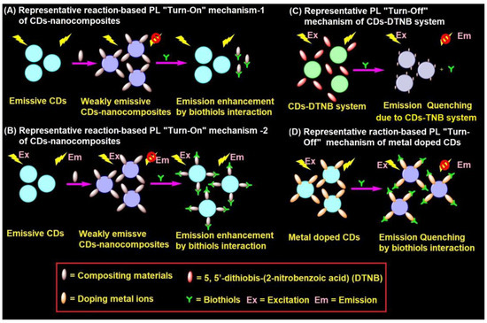 Representative (A,B) reaction-based PL “Turn-On” mechanism-1 and mechanism-2 of CD–nanocomposites, (C) PL “Turn-Off” mechanism of CD–DTNB system, and (D) reaction-based PL “Turn-Off” mechanism of metal doped CDs in the biothiols assay.