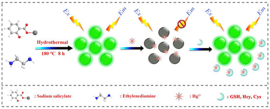 In a similar approach, green fluorescent CDs (CDs; average size = 2.75–4.25 nm; λem = 512 nm at excitation of 410 nm; PLQY = 12.3%) were hydrothermally synthesized from sodium salicylate and ethylenediamine (EDA) and were demonstrated in Hg2+ complex-mediated sensing of biothiols [92]. The emission of CDs is initially quenched in the presence of Hg2+ and then it recovers via interacting with Cys, Hcy, and GSH, as seen in Figure 4. The linear range of Hg2+ detection by CDs at pH 6.5 (BR buffer; BR = Briton Robinson buffer (made up from qual mixture of 0.1 M acetic acid, 0.1 M boric acid, and 0.1 M phosphoric acid)) was 0.05–10 μM with a LOD of 44 nM. Subsequently, the linear regression of Cys, Hcy, and GSH was 0.5–10 μM (for all) with LODs of 80 nM, 76 nM, and 69 nM, respectively. This report demonstrated Hg2+ and biothiols detection in real water and human plasma samples, respectively, with corresponding recovery of 101.6–105.5% (relative standard deviation (RSD) = 0.31–2.28%) and 91–92.5% (RSD = 0.71–0.99%), hence it can be regarded as an innovative work.