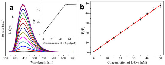 Blue emissive nitrogen-doped CDs (NCDs; average size = 2 nm; λem = 440 nm at excitation of 360 nm; PLQY = 35.4%) were hydrothermally synthesized from citric acid (carbon source) and ammonia solution (nitrogen source) and employed in the consecutive discrimination of Hg2+ and L-Cys [100]. PL emission of NCDs at 440 nm was static quenched by Hg2+ due to stable NCD–Hg2+ complex and was subsequently recovered by adding L-Cys via the greater Hg2+–S affinity. The Hg2+ complex-mediated quenching showed a linear response of 0–10 μM with a LOD of 1.48 nM, which was also effective in tap water-based interrogations (linear range = 0–10 μM; LOD = 1.65 nM). When adding L-Cys to the NCD–Hg2+ complexes at pH 7 (25 mM PBS), PL at 440 nm recovers linearly from 0–50 μM with a LOD of 0.79 nM, as shown in Figure 5. However, similar PL recovery of the NCD–Hg2+ complex was not observed when adding DL-Hcy and GSH, thereby confirming the selectivity of L-Cys. This report can be regarded as exceptional, but more focused work on interference and real-time studies is required.