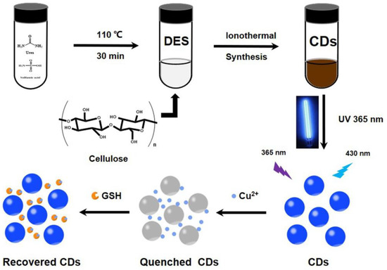 - Wang, Y.; Feng, M.; He, B.; Chen, X.; Zeng, J.; Sun, J. Ionothermal Synthesis of Carbon Dots from Cellulose in Deep Eutectic Solvent: A Sensitive Probe for Detecting Cu2+ and Glutathione with “Off-On” Pattern. Appl. Surf. Sci. 2022, 599, 153705. [Google Scholar] [CrossRef]