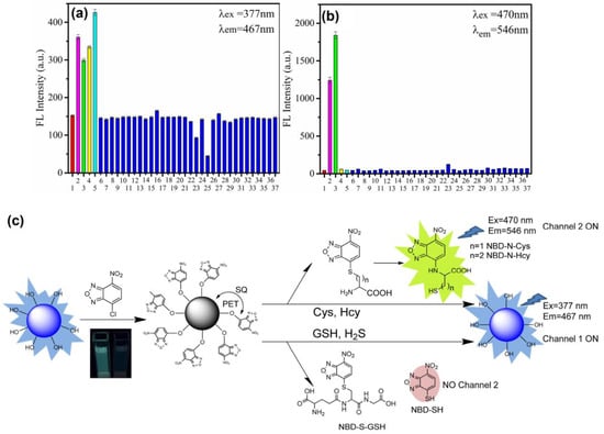 Detection and quantification of biologically important species are becoming important for treating infections and diseases existing in living systems [1,2,3]. Therefore, bioimaging of these affected tissues or cells was proposed by using fluorescent organic nanoparticles, inorganic nanostructures, hybrid nanosystems, and composites with authenticated evidence [4,5,6,7,8,9,10,11,12,13]. Among these biologically important species, non-protein biothiols, such as cysteine (Cys; normal blood plasma concentration is between 135 to 300 µM), homocysteine (Hcy; normal blood plasma concentration is between 5 to 15 µM), and glutathione (GSH normal blood plasma concentration is between 1 to 6 µM), play a vital role in many pathological process, clinical disorders, and diseases [14,15,16]. Cysteine plays an important role in protein/peptide synthesis, detoxification, cell metabolism, etc., and lack of cysteine may lead to hair depigmentation, liver damage, skin diseases, and cancer [17,18,19]. On the other hand, elevated cysteine levels can cause neurotoxic disorders [20,21]. Subsequently, homocysteine plays a role quite similar to cysteine. However, elevated concentrations of homocysteine in the blood plasma may lead to hyperhomocysteinemia, which is typically categorized into moderate (concentration = 15–30 µM of Hcy), intermediate (concentration = 30–100 µM of Hcy), and severe (concentration ≥ 100 µM of Hcy) disorders [22,23]. In fact, hyperhomocysteinemia can enhance other disorders, such as osteoporosis, dementia, Alzheimer’s disease, cardiac disorders, etc. [24]. Similarly, deficiency in glutathione decreases immunity and enhances the aging process [25]. Elevated levels of glutathione in the human body may enhance the resistance of cancerous cells to chemotherapy [26]. Individual biothiols play important roles in living systems. For example, they can coordinate with biomarkers to afford cancerous cell bioimaging and predict the therapeutic utilities of numerous drug delivery manuals [27,28]. Thereby, detection and quantification of biothiols is a highly important research topic in this field.
