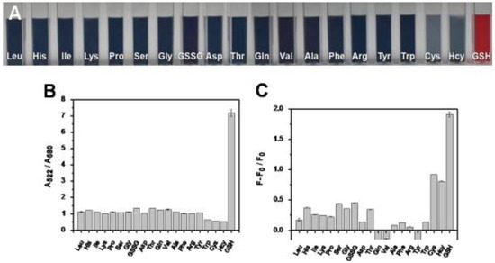 Similar to Hg2+ complex-mediated detection of biothiols, CDs also interact with Ag+ to form a complex, which can be engaged in the reversibility-enabled biothiols quantification, as described next. Shen et al. reported the detection of biothiols via inhibiting the CDs-mediated reduction of Ag+ towards the growth of silver nanoparticles (Ag NPs) [107]. The CDs (size = 3.1 ± 1.5 nm) were synthesized solvothermally from chitosan in 2% acetic acid at 180 °C for 12 h. The as-synthesized CDs reduced the Ag+ into Ag0 to generate Ag NPs, which can be visualized in the absorbance changes at 430 nm (colorimetric changes). This reaction was restricted by Cys, Hcy, and GSH due to a strong Ag+–S affinity. The absorbance linear concentrations were found as 2.5–30 nM, 5–40 nM, and 2.5–30 nM with LODs of 20 nM, 2.6 nM, and 1.2 nM, respectively. Although this report demonstrated the biothiols assay in plasma samples, it lacked fluorescence studies.