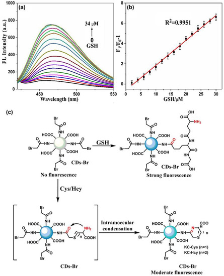 - Yan, F.; Ye, Q.; Xu, J.; He, J.; Chen, L.; Zhou, X. Carbon Dots-Bromoacetyl Bromide Conjugates as Fluorescence Probe for the Detection of Glutathione Over Cysteine and Homocysteine. Sens. Actuators B 2017, 251, 753–762. [Google Scholar] [CrossRef]
