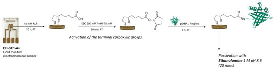 The gold electrodes were functionalized by slightly modifying the derivatization protocol described by Capo et al. (2022) []. Before functionalization, gold electrodes were cleaned by applying 12 potential cycles between −1.0 and +1.3 V with a 0.1 V/s scan rate in 0.05 M sulfuric acid. Then, a self-assembled monolayer (SAM) of thiols was prepared by immersing the clean gold substrates into a 40 mM solution of α-lipoic acid (ALA) for 20 h. Next, the terminal carboxylic groups of the organo-sulfur molecules immobilized on gold electrodes were activated by dropping 15 µL of 200 mM EDC and 50 mM NHS in PBS buffer (pH 7.4) on the surfaces. After 10 min of incubation, the EDC/NHS solution was removed. Subsequently, 15 µL of a 1.7 mg/mL pOBP sample (or GlnBP, used as a negative control) were deposited on the electrodes; after 2 h of incubation, the surfaces were washed three times with sterilized water. Lastly, 10 μL of 1 M ethanolamine (pH 8.5) solution was placed on the surfaces for 20 min to block unreacted active sites. A schematic diagram of the biosensor fabrication is presented in Figure 1.