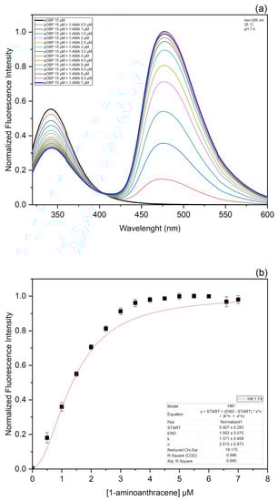1-AMA titration curve spectra and titration curves fitting: (a) The emission spectra of pOBP upon excitation at 295 nm were acquired in the absence and in the presence of different amounts of 1-AMA; (b) fluorescence emission intensity at 481 nm was plotted as a function of 1-AMA concentrations.