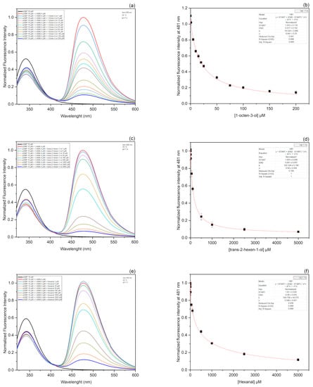 In order to validate the direct docking results and confirm the protein affinity for the selected VOCs, competitive FRET assays were performed for each VOC molecule. In this assay, the affinity of a ligand was evaluated on its ability to displace the fluorescence probe from the protein complex []. More precisely, the competition of 1-octen-3-ol (Figure 4a), trans-2-hexen-1-ol (Figure 4c), and hexanal (Figure 4e) with 1-AMA to the binding site of pOBP were observed by monitoring the displacement of 1-AMA at increasing concentrations of each VOC sample. The titration curves of 1-octen-3-ol, trans-2-hexen-1-ol, and hexanal are presented in Figure 4b,d,f, respectively. The kinetics parameters were calculated by plotting the decrease in the fluorescence intensity at 481 nm as a function of the concentration for each single VOC molecule. The dissociation constant values, calculated through a non-linear fitting function, are 18.5 mM for 1-octen-3-ol, 122.3 mM for trans-2-hexen-1-ol, and 349.7 mM for hexanal.