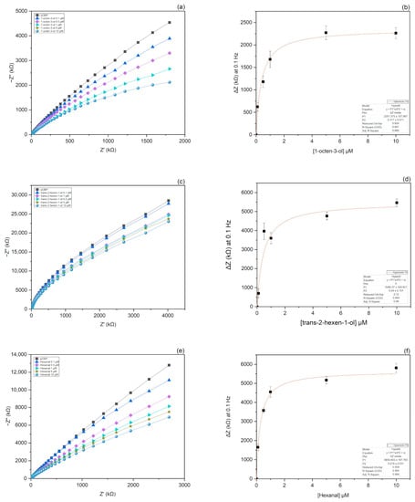 Nyquist plots and binding curves fitting of 1-octen-3-ol, trans-2-hexen-1-ol, and hexanal. Nyquist plots represent the impedance response of the biosensor to increasing concentrations of 1-octen-3-ol (a), trans-2-hexen-1-ol (c), and hexanal (e). As a consequence of the binding events at the interface, the impedance of the electrochemical system increases at increasing concentrations of the VOC samples. Binding curves were obtained by plotting the change in impedance at 0.1 Hz as a function of 1-octen-3-ol (b), trans-2-hexen-1-ol (d), and hexanal (f) concentration. The fitting curves, obtained by a non-linear function, are highlighted in red color.