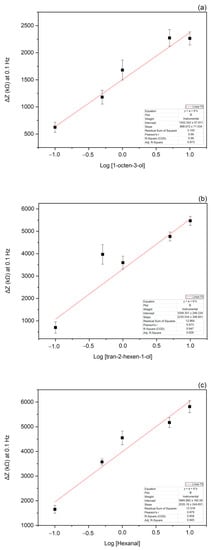 Calibration curves of 1-octen-3-ol, trans-2-hexen-1-ol, and hexanal. The fitting curves were obtained by plotting the logarithmic value of 1-octen-3-ol (a), trans-2-hexen-1-ol (b), and hexanal (c) concentrations versus the change of the impedance value at 0.1 Hz.
