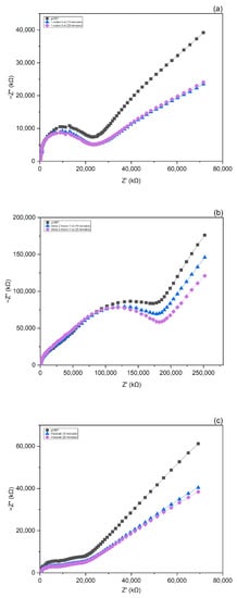 A non-Faradaic Nyquist plot exhibits a large incomplete semicircle tending to infinity in the low-frequency region. The lack of a redox probe eliminates the parameters associated with electron transfer, such as charge transfer resistance (Rct) and Warburg impedance. As a result, the partial semicircle, due to the extremely slow electron transfer, is not followed by the typical diffusion tail [,]. Moreover, the solution resistance (Rsol) in the high-frequency region is attributable to the bulk ionic concentration. Therefore, the impedance of a non-Faradaic sensor is determined by the insulating characteristics of the VOC sample bond to the conductive substrate []. The binding phenomena occurring at the electrode interface generate a charge perturbation observable in the Nyquist plot as a decrease in the imaginary part of impedance (−Z″) in the low-frequency regime with increasing VOC concentrations (Figure 5).