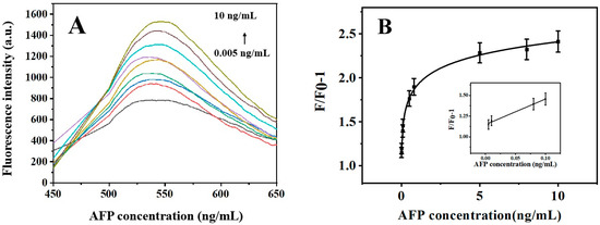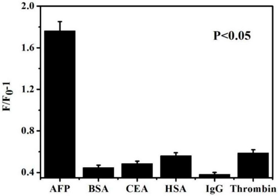 - Zhou, L.; Ji, F.; Zhang, T.; Wang, F.; Li, Y.; Yu, Z.; Jin, X.; Ruan, B. An fluorescent aptasensor for sensitive detection of tumor marker based on the FRET of a sandwich structured QDs-AFP-AuNPs. Talanta 2019, 197, 444–450. [Google Scholar] [CrossRef]