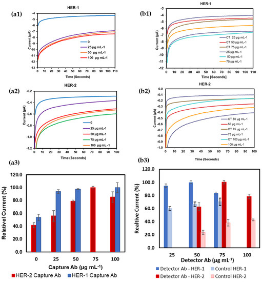 Chronoamperometric signal for SPGE; (a1) different concentrations of monoclonal anti-HER-1; (a2) anti-HER-2 as the capture antibody; (a3) the relative current percentage calculated for each concentration for both HER-1 and HER-2; (b1) different concentrations of polyclonal anti-HER-1; (b2) anti-HER-2 as the detector antibody; (b3) the relative current percentage calculated for each concentration for both HER-1 and HER-2. Standard deviations were calculated for experiments performed in triplicate. In (b1,b2) CT stands for control readings.