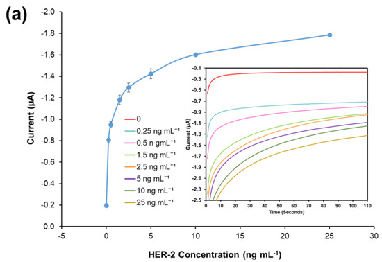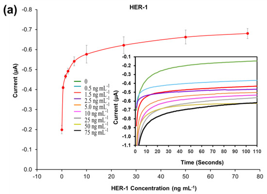 Biosensors responses of the optimized immunoassays against various concentrations of; (a) HER-1 antigen (0.5–75 ng mL−1); (b) HER-2 antigen (5–200 ng mL−1). Measurements were taken after 110 s at a potential of −200 mV. Embedded graphs show the raw data obtained. (c) Linear regression of the HER-1 and HER-2 assay, obtained with data taken from Figure 2a,b. Standard deviations were calculated for experiments performed in triplicate (n = 3).