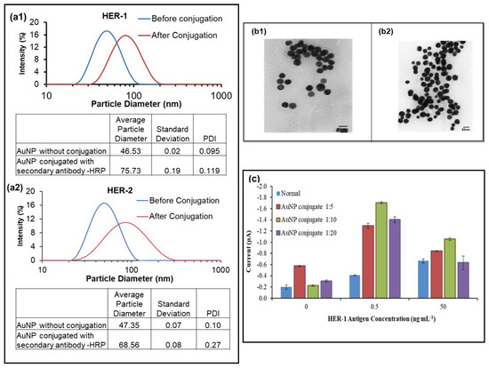 Hence, the use of AuNPs for the sensor assay was investigated to enhance the signal and amplify the sensitivity of both immunosensors. The anti-species-HRP Ab (secondary antibody) was replaced with AuNP conjugated with the anti-rabbit-HRP Ab (for HER-1) and anti-goat-HRP Ab (for HER-2). The adsorption of the anti-goat and rabbit Ab-HRP onto the AuNPs was aided by a combination of ionic and hydrophobic interactions between the Ab-HRP molecules (negatively charged) and AuNPs (positively charged). To observe that the conjugation was successful, dynamic light scattering (DLS) was conducted on the AuNP before and after conjugation with the anti-species Ab. Figure 3(a1,a2) shows that the HER-1 and HER-2 conjugation was considered successful, as a shift was seen in the size of the AuNP from 46.53 ± 0.02 nm before to 75.73 ± 0.19 nm after conjugation for HER-1 and from 47.35 ± 0.07 nm before to 68.56 ± 0.08 nm after conjugation for HER-2. The shift observed was due to the adsorption of the anti-species Ab labelled with HRP onto the gold nanoparticle, increasing the diameter of the AuNP. Figure 3(b1,b2) shows the TEM images of the AuNP before and after conjugation with the anti-rabbit-HRP Ab (for HER-1).