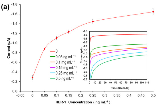 Biosensor response of the optimized immunoassay performed using AuNP-Ab-HRP conjugates against various concentrations of; (a) HER-1 antigen (0–0.5 ng mL−1) and (b) HER-2 antigen (0–50 ng mL−1). The embedded graphs show the raw data reading obtained from the chronoamperometry measurements. (c) Linear regression curves for HER-1 and HER-2 AuNP-Ab-HRP conjugate assay, obtained with data taken from Figure 4a,b. Standard deviations were calculated for experiments performed in triplicates (n = 3).