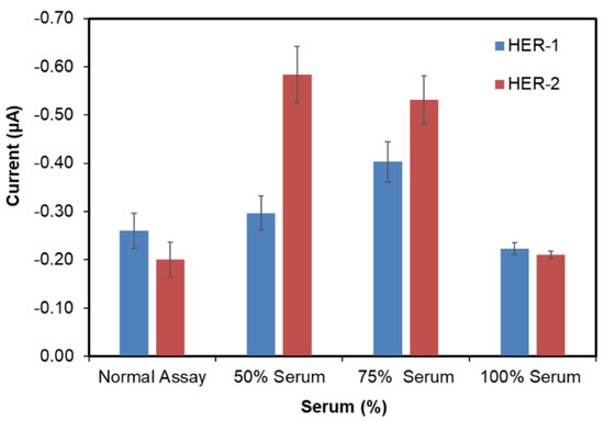 In order to develop a clinically relevant sensor, it is essential to validate the assay in the biological fluid of choice (i.e., human serum). Therefore, in this work commercial serum both diluted (50% and 75%) and undiluted (100%) was tested, where to obtain 50% and 75%, the serum was diluted with PBS. All three serum dilutions were first tested with no antigen to evaluate the non-specific binding. From Figure 5, it can be observed that the 100% serum showed the lowest signal for both HER-1(−0.22 μA) and HER-2 (−0.20 μA), compared to 50% (−0.3 μA for HER-1 and −0.6 μA for HER-2) and 75% (−0.4 μA for HER-1 and −0.5 μA for HER-2) serum. Furthermore, when comparing the signal produced by 100% serum and the signal produced from the normal (buffer) assay control (−0.26 μA for HER-1 and −0.16 μA for HER-2), the interference of the serum seemed to be low as both results appear very similar. The reason behind the low interference of whole serum (100% serum) in the electrochemical immunosensors might be due to the ability of some of the components in the serum to further block the surface of the sensor, minimizing the interference from the serum itself. Such components are not as concentrated, and therefore, not as effective when serum is diluted with PBS. This shows the advantage of using screen-printed electrodes and chronoamperometry when compared to non-labelled techniques such as Surface Plasmon Resonance (SPR) and Quartz crystal microbalance (QCM), which require much better control of non-specific binding [43,50]. Hence as the result obtained for undiluted serum showed the lowest non-specific adsorption, it was decided that this would be used for future serum assay work for both the normal and the gold nanoparticle serum assay.