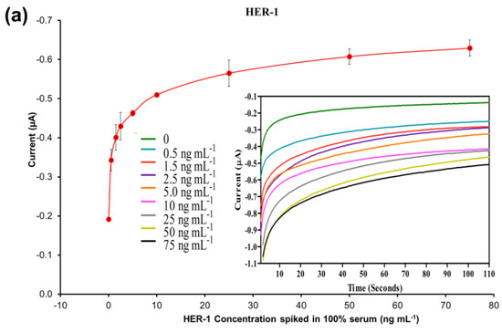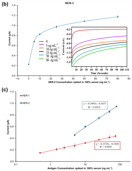 Standardized biosensor response of the optimized immunoassay against increasing concentrations of (a) HER-1 antigen (0.5–75 ng mL −1); (b) HER-2 antigen (5–80 ng mL−1) spiked in 100% serum. Embedded graph shows the raw chronoamperometry measurements. (c) Linear regression of the assay spiked in serum samples with data taken from Figure 6a,b. Standard deviations were calculated from experiments performed in triplicate (n = 3).