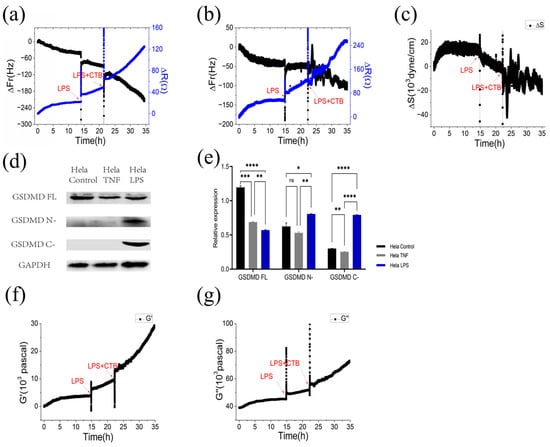 Dynamic QCM responses and cytomechanical parameters recorded during LPS and CTB induced pyroptosis in 2000 HeLa cells. (a,b) Frequency shifts and motional resistance changes on AT (a) and BT (b) cut quartz crystal; (c) Cells generated force on quartz crystal; (d) Effects of pyroptosis induced by LPS and CTB on GSDMD cleavage through Western blot assay. The loading control is GAPDH expression; (e) The relative expression of target protein/GAPDH was analysed by Image-Pro Plus 6.0 Software (* p < 0.05, ** p < 0.01, *** p < 0.001, **** p < 0.0001); (f) Variations of the elastic modulus (storage modulus) G′; (g) Variations of the viscous modulus (loss modulus) G″.