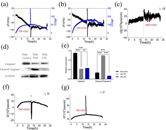 Dynamic QCM responses and cytomechanical parameters recorded during TNF and CHX induced apoptosis in 2000 HeLa cells. (a,b) Frequency shifts and motional resistance changes on AT (a) and BT (b) cut quartz crystals; (c) Cells generated force on quartz crystal; (d) Effects of apoptosis induced by TNF and CHX on Caspase3 cleavage through Western blot assay. The loading control is GAPDH expression; (e) The relative expression of target protein/GAPDH was analysed by Image-Pro Plus 6.0 Software (** p < 0.01, **** p < 0.0001); (f) Variations of the elastic modulus (storage modulus) G′; (g) Variations of the viscous modulus (loss modulus) G′.
