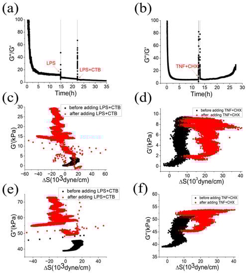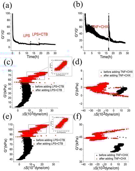 Changes in loss tangent and correlations between cytomechanical parameters during the LPS and CTB induced pyroptosis and TNF and CHX induced apoptosis in 2000 HeLa cells on FN modified quartz crystal-Au surfaces. (a,b) changes in loss tangent η = G″/G′; (c) G′ versus ΔS correlation during LPS+CTB stimulation; (d) G′ versus ΔS correlation during TNF+CHX stimulation; (e) G″ versus ΔS correlation during LPS+CTB stimulation; (f) G″ versus ΔS correlation during TNF+CHX stimulation.