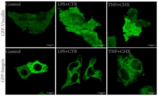 The expressions of integrin and vinculin in pyroptosis and apoptosis. HeLa cells were transfected with GFP-vinculin and GFP-integrin constructs. The upper row depicted the vinculin expressions in control group in response to LPS and CTB, TNF, and CHX stimulations. The lower row depicted the integrin expressions in control group in response to LPS and CTB, TNF, and CHX stimulations.