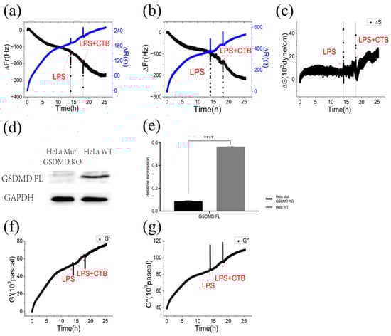 Dynamic QCM responses and cytomechanical parameters recorded during LPS and CTB induced pyroptosis-resistance in 2000 GSDMD−/−-DEVD- mutant expressing HeLa cells. (a,b) Frequency shifts and motional resistance changes on AT (a) and BT (b) cut quartz crystals; (c) Cells generated force on quartz crystal; (d) GSDMD knockout cells generated by CRISPR-CAS9-mediated targeting, and its expression is verified through Western blot assay. The loading control is GAPDH expression; (e) The relative expression of target protein/GAPDH was analysed by Image-Pro Plus 6.0 Software (**** p < 0.0001); (f) Variations in the elastic modulus (storage modulus) G′; (g) Variations in the viscous modulus (loss modulus) G″.