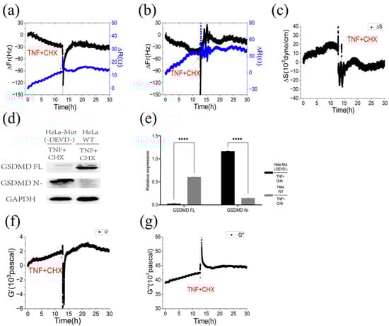 Dynamic QCM responses and cytomechanical parameters recorded during TNF and CHX induced pyroptosis in 2000 GSDMD−/−-DEVD- mutant expressing HeLa cells. (a,b) Frequency shifts and motional resistance changes on AT (a) and BT (b) cut quartz crystals; (c) Cells generated force on quartz crystal; (d) Switch of TNF induced apoptosis to pyroptosis by caspase-3 sensitive GSDMD mutant. GSDMD-DEVD- (replacement of the FLTD motif with the caspase-3-cleavage site DEVD) was stably expressed in HeLa GSDMD−/−cells. Cells were treated with TNF and CHX for 8 h, GSDMD was proteolytically cleaved into specific size, GSDMD N- can then be detected upon TNF and CHX stimulation through Western Blot assay. GAPDH expression is the loading control; (e): The relative expression of target protein/GAPDH was analysed by Image-Pro Plus 6.0 Software (**** p < 0.0001); (f) Variations in the elastic modulus (storage modulus) G′; (g) Variations in the viscous modulus (loss modulus) G″.