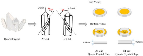 Schematic illustrations of AT and BT cut crystals. AT cut quartz crystal is cut at an angle of 35°15′ relative to the Z axis, whereas BT cut quartz crystal is cut at an angle of −49° relative to the Z axis. The crystal blanks are then cut in their respective orientations to the crystal axis before being machined and completed to the required sizes.