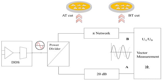 Illustration of the principle of measurement. DDS (Direct digital frequency synthesizer) generated the required scanning frequency, then the signal was split into two parts by the power divider. One was sent to channel A of the vector measurement unit with 20 dB attenuation as the reference signal, and the other was sent to channel B of the vector measurement unit through the π-Network. The quartz crystal resonators were connected into the πNetwork. The vector measure unit measures the voltage ratio and the phase difference between the two channels. Then, the frequency shift, motional resistance, motional inductance, and static capacitance were determined by the special algorithm of the software.
