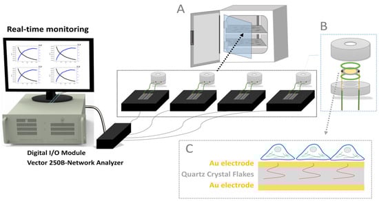 Schematic illustration of the fabrication of QCM-based DRPC and the measurement principle. (A) The measurement component and Teflon wells can be placed in an incubator set to 37 °C, 5% CO2, allowing four channels to operate concurrently. (B) The exploded-view of a Teflon well, AT and BT cut quartz crystals were held in a Teflon well with two tinned copper wires that were PVC-wrapped (polyvinyl chloride). The tinned copper was then inserted into an electrical conductor that was connected to the 250B network analyzer. (C) The side-view of cells adhesion on quartz crystal-Au electrode.