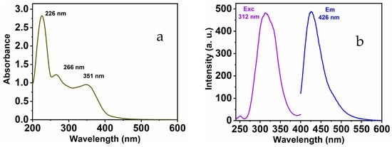 The as-prepared MNC chemical sensor shows distinguishing optical characteristics; these features were collected in a 1:9 (v/v) DMSO-HEPES buffer solution (20 mM, pH = 7.4) (see Figure 1). Under excitation with 312 nm, the free chemical sensor displays a distinct peak located at 426 nm. In addition, the absorbance spectra provide the existence of three maximums at 226, 266, and 351 nm correspondingly. These peaks might be ascribed to π-π* and n-π* transitions.