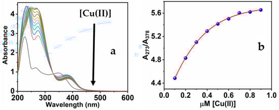(a) The UV-Vis spectra of MNC throughout the gradual adding Cu(II); (b) the relation of the band ratios at 273 and 378 nm (A273/A378) against [Cu(II)].