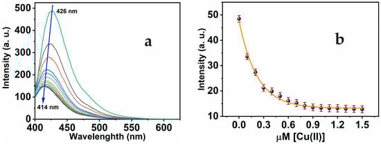 (a) Luminescence of MNC 10 μM in a 1:9 (v/v) DMSO-HEPES buffer (20 mM, pH = 7.4) during gradual adding Cu(II) of 0–1.5 μM range, λexc 312 nm; (b) calibration curve of MNC intensity versus [Cu(II)].