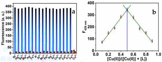 (a) Maximum luminescence intensities of the MNC sensing molecule (I) in the presence of various metal ions (blue bar) and (II) in the presence of the same metal ions and Cu(II) ions (red bar). The ratio of (MNC: Cu(II): M(II) has a 1:1:1 ratio (λex = 312 nm); (b) Job’s plot of MNC with Cu(II) ions.