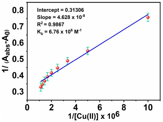 where A0, Aabs, and Ac are the absorption values in the absence of, at the intermediate, and at the saturation of Cu(II) ion interaction, respectively, and [Cu(II)] indicates the concentration of Cu(II) ion added. By linearly fitting an absorbance titration curve, the binding constant (Kb) was calculated (Figure 9). The greater value of the binding constant (6.76 × 106 M−1) suggests that the interaction between MNC and Cu(II) ion is strong.
